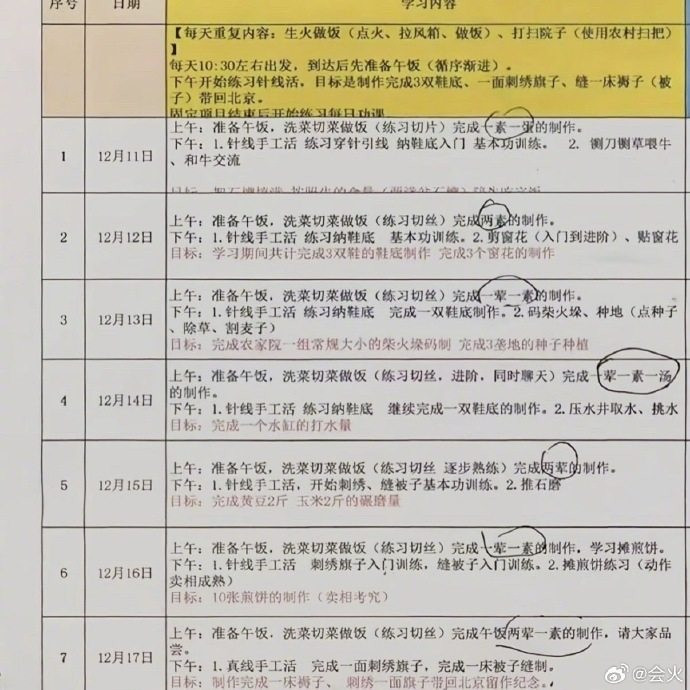 剧中主角们的农活,都是真干。有网友曝出杨幂(扮演女主角宁绣绣)进组前的学习过程表,内部不仅要学习洗菜切菜作念饭,还要学习针线活,以致还要学习怎样和牛沟通。