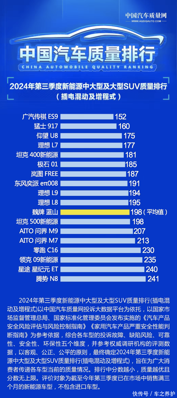 跟着汽车学问的普及度逐渐加多,糜掷者在购车时也会参考更多方向来匡助我方的方案,其中整车质料成为了当今全国较为心疼的要领,近期中国汽车质料网发布了第三季度新能源中大型及大型SUV的质料排行榜,接下来咱们就从举座排名情况来一窥当今市集上主流车型的进展,以匡助全国更好地作念出购车方案。