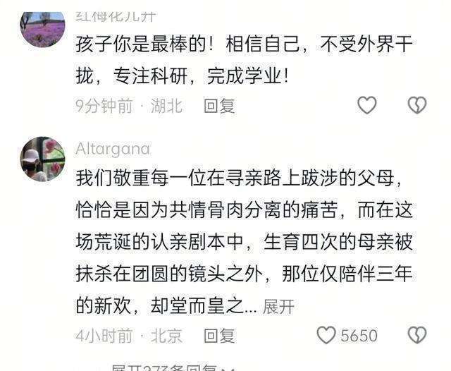 在我看来,网友们的盛怒是有迹可循的。一位母亲生养了4个孩子,这本等于一件极其伟大且沉重的事情。她荜路蓝缕地养大孩子,却没比及女儿回来就遭逢了差异的气运,这无疑是一种雄伟的悲情。而且,在女儿认亲这样紧要的时刻,这位姆妈全程都莫得出镜,这就像是一场尽心磋磨的盛宴却少了最遑急的嘉宾。在巨匠的不雅念里,即便细君仍是分开,关联词在孩子归来的这个非凡时刻,一家东说念主聚在沿途拍一张全家福,这是一种最基本的尊重,是亲情纽带在这一非凡场景下的应干系照。